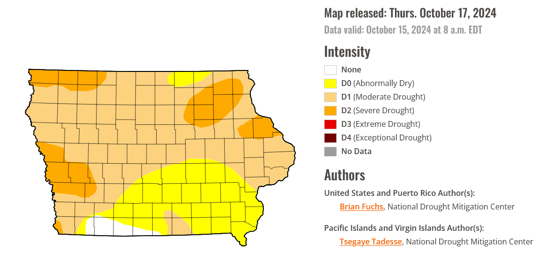 (Radio Iowa) – A map released this (Thursday) morning by the U-S Drought Monitor shows -all- of Iowa is again experiencing some level of drought. Last week’s map showed about two-and-a-half percent of the state was still in the normal category, but even that’s gone now. The new map indicates about 16-percent of Iowa is abnormally dry, all in south-central Iowa, while almost two-thirds of the state is in moderate drought. That leaves about 19-percent that’s in severe drought, with large patches of that category in northwest, west-central and northeast Iowa. As yet, none of the state’s in the worst two levels of extreme or exceptional drought.
