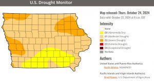 (updated) [Radio Iowa] – The latest U-S Drought monitor map is showing more color, which is not what the state needs to see, as that indicates more drought. D-N-R hydrologist Tim Hall says there’s just a small patch of clear area on the map near the Missouri border. “Ninety-eight percent of the state is now at least in abnormal dry, if not drought, conditions. And actually the big change this week is we just about doubled the amount of the states that validated in severe drought in northeastern and northwestern and western Iowa,” Hall says. Hall says the concern level is not very high at this point.