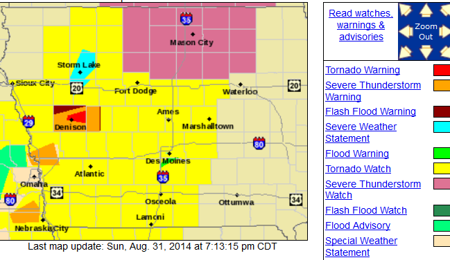 759 PM CDT SUN AUG 31 2014 THE NATIONAL WEATHER SERVICE IN OMAHA HAS ISSUED A * SEVERE THUNDERSTORM WARNING FOR... NORTHEASTERN POTTAWATTAMIE COUNTY IN SOUTHWEST IOWA... SOUTHEASTERN SHELBY COUNTY IN SOUTHWEST IOWA... * UNTIL 845 PM CDT * AT 759 PM CDT...A SEVERE THUNDERSTORM WAS LOCATED NEAR PERSIA...OR 27 MILES NORTHWEST OF ATLANTIC...MOVING EAST AT 45 MPH. HAZARD...60 MPH WIND GUSTS. SOURCE...RADAR INDICATED. IMPACT...EXPECT DAMAGE TO ROOFS...SIDING AND TREES. * LOCATIONS IMPACTED INCLUDE... HARLAN...AVOCA...WALNUT...ELK HORN...SHELBY...TENNANT...KIRKMAN... NISHNA BEND RECREATION AREA...PRAIRIE ROSE STATE PARK AND ELK HORN CREEK RECREATION AREA. THIS INCLUDES THE FOLLOWING HIGHWAYS... HIGHWAY 59 IN IOWA BETWEEN MILE MARKERS 64 AND 80. INTERSTATE 80 IN IOWA BETWEEN MILE MARKERS 31 AND 48. PRECAUTIONARY/PREPAREDNESS ACTIONS... FOR YOUR PROTECTION MOVE TO AN INTERIOR ROOM ON THE LOWEST FLOOR OF A BUILDING.