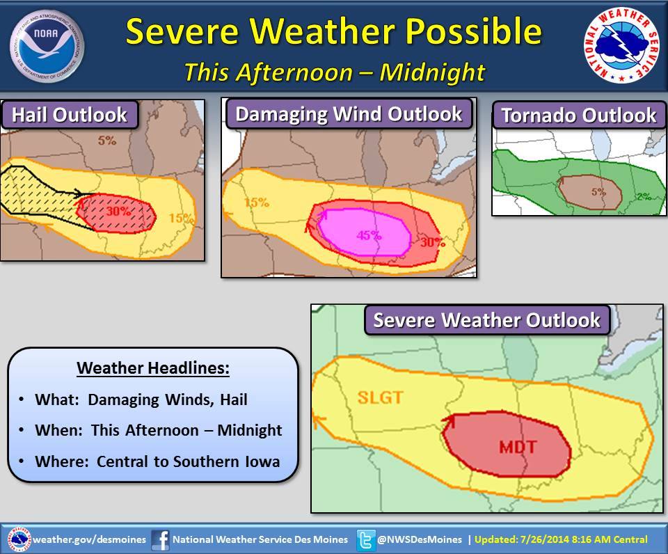 The National Weather Service says people in Iowa should be prepared for severe weather, especially this afternoon and this evening. In their web briefing late this (Saturday) morning, officials said the primary threat from storms will be damaging winds and large hail, lightening, and heavy downpours of rain.