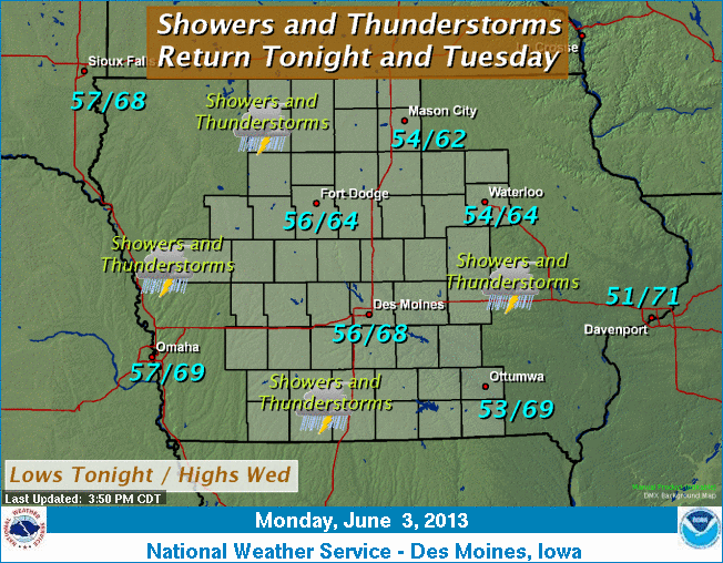 A few of the storms may be strong to severe by Tuesday with large hail the main threat. Some may also produce locally heavy rains, but likely not of sufficient duration to produce additional flooding. After a break late Thursday or Friday, additional chances for showers and storms return to the forecast over the weekend. There is a better potential for heavy rain which may lead to flooding by this time, but relegated to far southern Iowa and into Missouri.