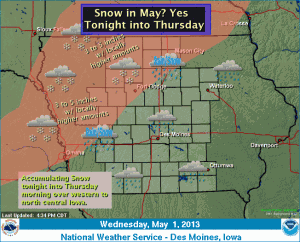 THE NATIONAL WEATHER SERVICE IN DES MOINES HAS ISSUED A WINTER WEATHER ADVISORY FOR HEAVY WET SNOW…WHICH IS IN EFFECT FROM 10 PM THIS EVENING TO 10 AM CDT THURSDAY.