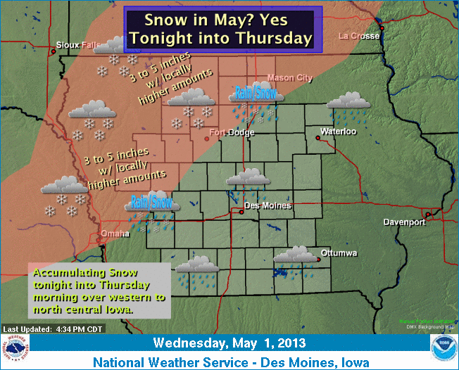 Some locally higher snow amounts are possible over far north-central portions of the state. Rain will gradually switch over to snow further southeast mid to late evening from Mason City to Denison line. All rain is expected across central to southern Iowa tonight into Thursday. Another round of snow is forecast to develop Thursday night into Friday over central and northern Iowa.
