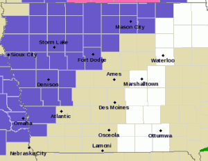 A band of moderate to locally heavy snow is forecast to bring 3 to 5 inches across western to north central portions of Iowa this evening into Thursday morning.