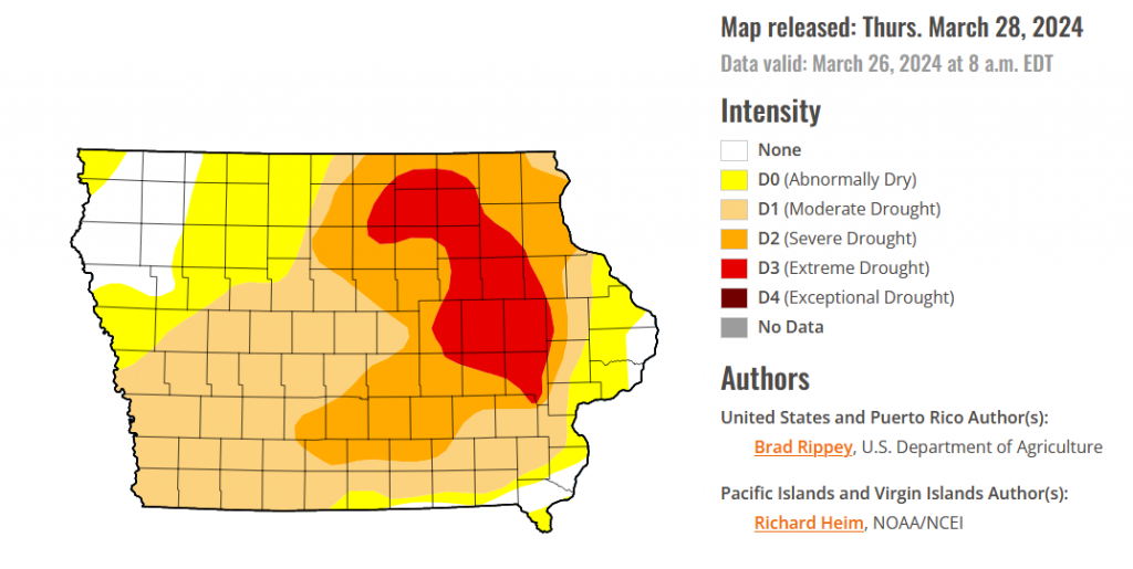 (Radio Iowa) – The recent snow and rains have helped push back some of the drought conditions in the state. D-N-R Hydrologist, Tim Hall, the rainfall has been good to see. “The statewide average over the last seven days, three times the normal rainfall for that seven day period. And for the month of March, we’re ahead of normal. And so those things are all reflected in the U-S Drought Monitor this week,” Hall says. Northeast Iowa remains the driest area of the state, but the picture is better than last week.