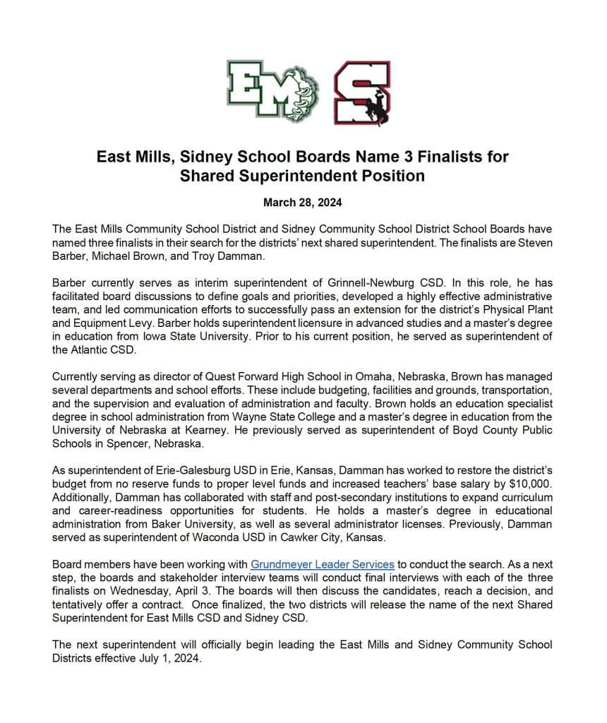 (Mills County, Iowa) – The former Superintendent for the Atlantic Community School District is among three Superintendent finalists for the shared East Mills and Sidney School Districts. In a press release (shown below), school officials with the two districts announced Thursday they had narrowed their search to Steven Barber, Michael Brown, and Troy Damman. Barber served as the Atlantic School District Superintendent for six-years before resigning in June, 2023. He currently serves as the interim superintendent of the Grinnell-Newburg School District.