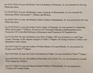 (Shenandoah, Iowa) – The Shenandoah Police Department, Tuesday, released a report on arrests that occurred from March 1st through March 11th.