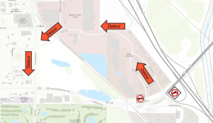 During this work, the traffic signal will be flashing red for all directions and temporary stop signs will be in place. Northbound left turns will be prohibited from the southbound Interstate 29 exit ramp. You will be detoured north on Metro Drive and Denmark Drive, west on 35th Avenue, and south on the South Expressway back to U.S. 275.
