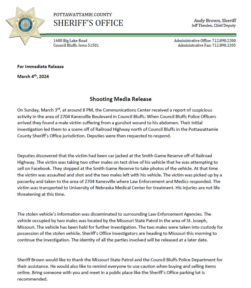 The following is a press release from the Pottawattamie County Sheriff’s Office, with regard to a shooting incident during an alleged carjacking incident that took place Sunday night: