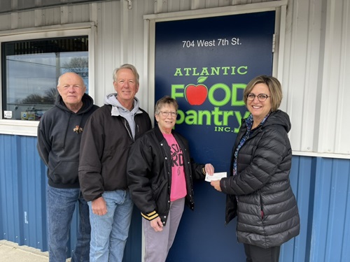 Shown are (right to left) Sara Nelson, Xi Beta Phi, presenting the $1524 donation to Atlantic Food Pantry representatives June Halder, Brad Osborne and Chuck McClaren.