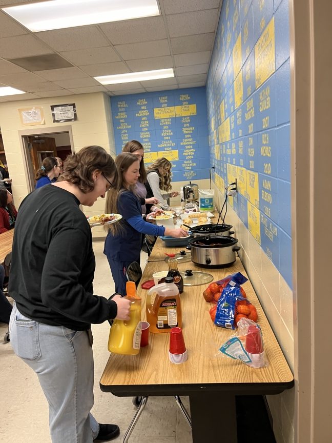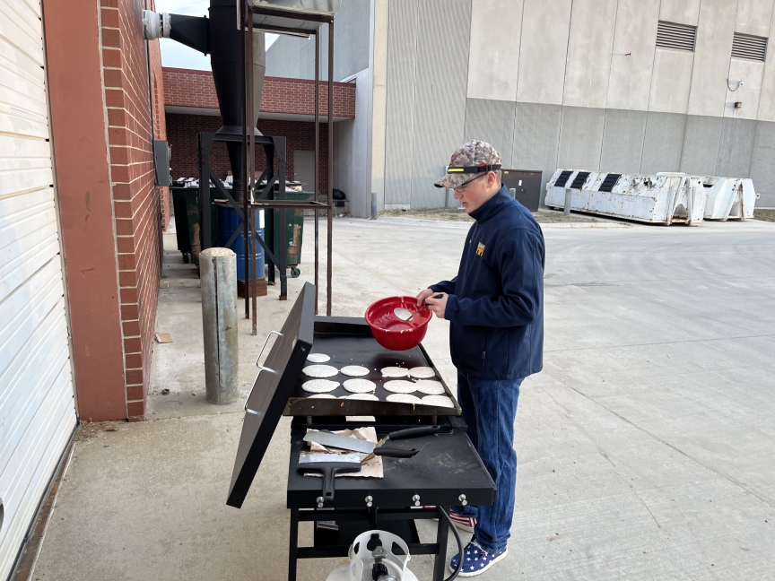 Atlantic FFA Chapter Officer Team cooked breakfast for the staff at AHS. The morning began by FFA members cooking Butterbraids in the FCS kitchen. Chapter President Colton Rudy then used a Blackstone griddle that was purchased with a giftcard from Tractor Supply in Atlantic to cook sausage links, bacon, eggs and finally pancakes. FFA Officers Charli Goff, Lola Comes, Lily Johnson and Claire Pellett kept Colton supplied with food for the griddle and set everything up in the Ag room. The meal was a success and Atlantic History Teacher Terry Hinzman said, “The FFA is very visible in the school district thanks to Mr Miller and the do a lot behind the scenes stuff at the school.”
