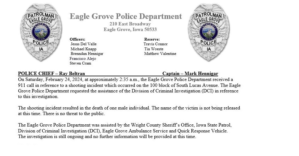 On Saturday: 34-year-old Donald James Simmerman, of Murray, was arrested at the Creston Union County LEC. He was taken into custody at around 1:18-a.m. and charged with Interference with Official Acts and OWI 2nd Offense. Simmerman was taken to the Union County Jail where he was later released on $2300 cash or surety bond; At around 1:45-p.m., Saturday, 24-year-old Noah Alexander Young, of Creston, was arrested at 807 W Summit. Young was charged with Providing False Identification Information and a Union County Warrant for FTA Disorderly Conduct-Loud Raucous Noise. Young was taken to the Union County Jail where he was later released on $300 cash or surety bond; and, 24-year-old Jeffery Allen Arnold, of Creston, was arrested Saturday at the intersection of Wyoming and 34. Arnold was charged with Driving while under Suspension. Arnold was cited and released from the scene on Promise to Appear.