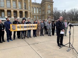 (Radio Iowa) – The Teamsters have staged an hour-long protest outside the Iowa Capitol over a bill about certification votes for unions representing state and local government workers. “We’re standing up, we’re fighting back, we’re united and this is just the beginning,” Teamsters Local 238 Secretary-Treasurer Jesse Case said during a news conference on the Capitol steps.