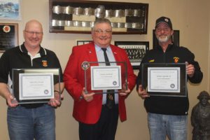 Shawn Page, Tom Cappel and Chris Towne were recognized for being a member of the department for 25 years. Pictured are (from left to right) Page, Roger Bissen, past IFA president and current president of the Iowa Fire Chief Association holding Towne’s award since he was not present at the banquet and Cappel.