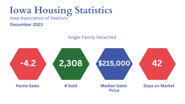 (West Des Moines, Iowa) – Low inventory and high interest rates proved to be the driving forces in a slower-than-typical Iowa housing market in 2023. Nearly every metric tracked by the Iowa Association of REALTORS® (IAR) saw a decline this year. These issues weren’t unique to Iowa, however, they mimicked the housing market nationwide, as buyers and sellers took their time jumping into the market. IAR President Shaner Magalhães said “The past year saw a number of challenges for the housing market across the country, and Iowa wasn’t immune. But we’ve also seen glimmers of progress in the market. Just this month, inventory increased, a sign that 2024 will prove to be a bit more robust in the Iowa housing market.”