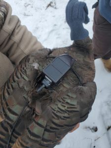 Hen turkey outfitted with a transmitter as part of the 10-year Iowa turkey population study. Photo courtesy of the Iowa DNR.