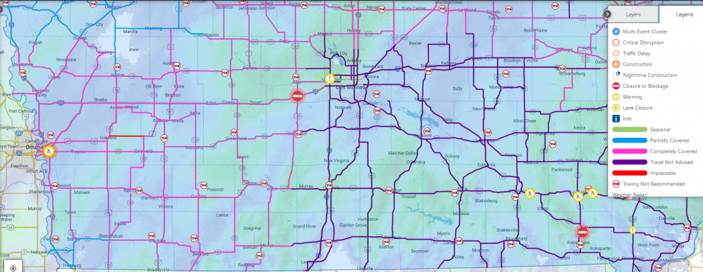 (Radio Iowa) – As of Noon today (Friday), the Iowa D-O-T says travel is not advised on several hundred miles of Iowa roads. In addition to the thoroughfares being completely snow covered, there’s poor visibility due to blowing and drifting snow. Hamilton County Sheriff Doug Timmons says the snowfall is heavy and the winds are strong, so it’s hard for state and county crews to keep the roads clear. “They’re doing the plowing as best as they can keep up with it,” Timmon says. “Travel is not recommended. Stay home. If you get stuck, there’s a good chance we’re gonna get stuck, and we’re not going to be able to get to you, so you’re taking your life in your own hands.”