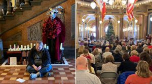 Reynolds joined a large crowd gathered in the Capitol today (Tuesday) for a midday prayer service. The crowd gathered around a Christmas tree and a nativity scene that are in the center of the Capital rotunda. The smell of incense from the Satanic Temple display near the main staircase wafted over the crowd.