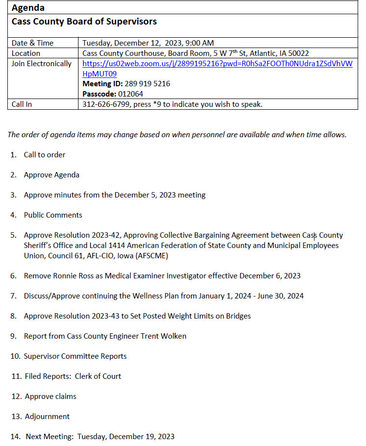 The Board is also expected to act on removing Ronnie Ross as Medical Examiner Investigator, retroactive to Dec. 6, 2023, and passing a Resolution to set Posted Weight Limits on County Bridges. They will also continue, and possibly act on approving, the Cass County Wellness Plan (effective from Jan. 1, 2024 through June 30, 2024).