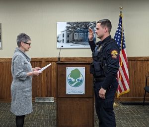 (Atlantic, Iowa) – Atlantic Mayor Grace Garrett, tonight (Wednesday night), issued the Oath of Office to the City’s newest Police Office. Nicholas Whipple, a Bedford High School graduate and a certified police officer in the State of Iowa was sworn-in during the City Council’s regular meeting. He’s served with the A-PD since this past November.