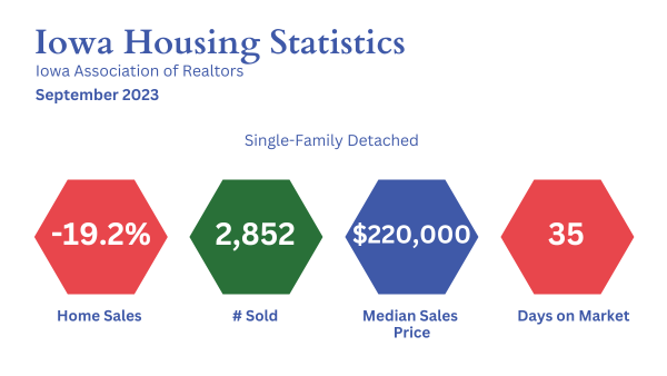 (West Des Moines, Iowa) – As the summer season waned, so too, did the Iowa Housing Market in September with declines in nearly all metrics measured by the Iowa Association of REALTORS®. The dip in metrics follows national trends, a result of higher interest rates, lower inventory and rising prices. While the trajectory might at first appear dismal, there are glimmers of hope. The market continues to create competition for prospective buyers, a welcome sign for sellers, with bidding wars and some homes selling above asking price. IAR President Krista Clark said Friday (Today) “As Iowans fall back into their routines with school starting, many aren’t looking to uproot and the September housing market is a reflection of that. Still, we’re seeing a competitive market for those who are looking for a change. We encourage prospective buyers and sellers to reach out to their trusted REALTOR® to examine their options when jumping into the market.”
