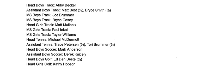 The Board will act on approving contract recommendations for: Lily Renfro – Elementary Paraeducator; Rick Boysen – Substitute Bus Driver, and the following Spring 2024 Sports Coach recommendations from High School Asst. Principal/Activities Director Andy Mitchell: