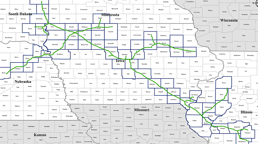 Navigator CO2 Ventures seeks to build about 1,350 miles of carbon dioxide pipeline in five states. (Map courtesy of Navigator CO2 Ventures)