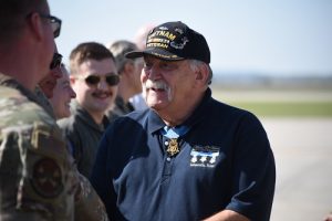 Medal of Honor recipient Michael J. Fitzmaurice greets 185th Air Refueling Wing members after a flight on a KC-135 September 19, 2023. (U.S. Air National Guard photo by Master Sgt. Daniel Ter Haar)
