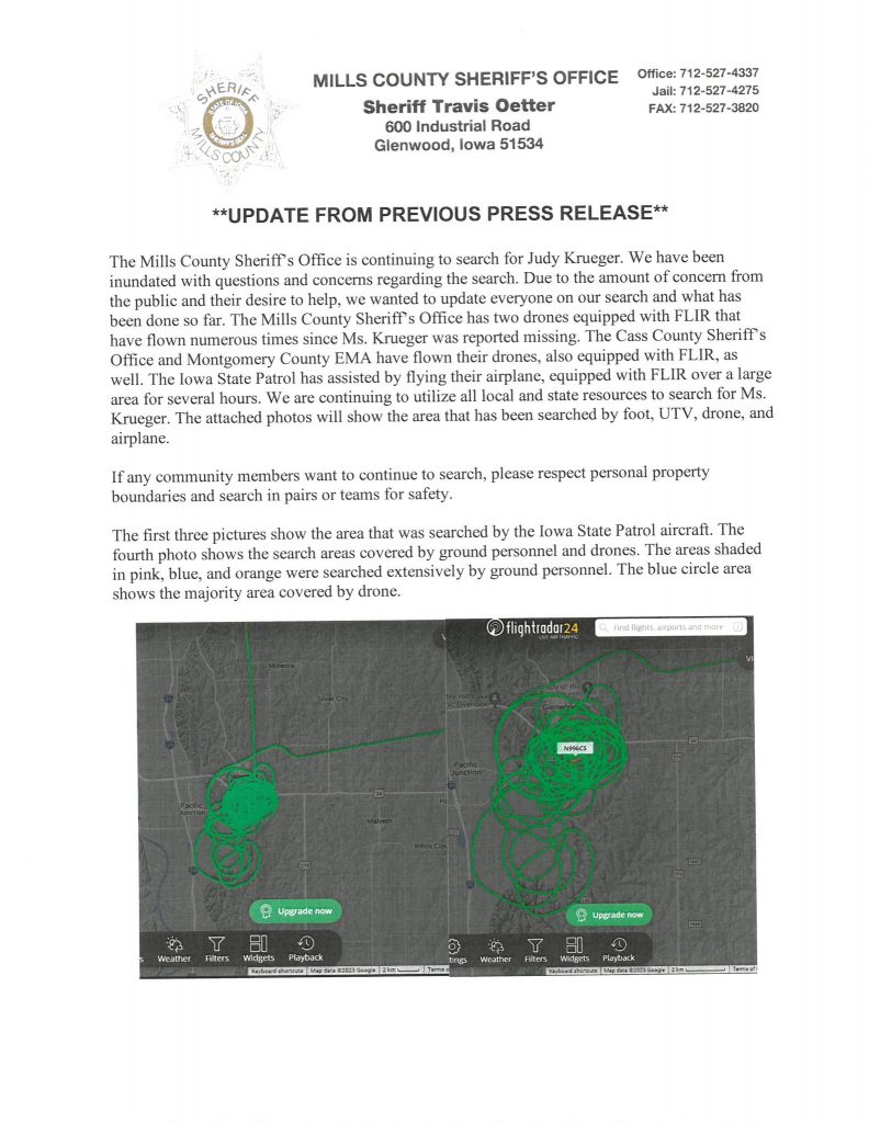 (Press Release: 11-a.m., Sept. 18, 2023) – The following is an update from the Mills County Sheriff’s Office, with regard to our earlier posts about 73-year old Judy Krueger, from Glenwood, who was reported missing after having last been seen at around 1:30-p.m. Saturday, when she left her residence on foot. Judy Krueger is 5-feet three-inches tall, she weighs about 130-pound, has reddish gray hair, and suffers from Dementia. She was last known to be wearing jeans, and 2-to-3 layered t-shirts. She also has a bracelet with her husband’s contact information on it.