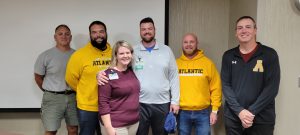 Coaches from Atlantic High School came to help present the IHA Hospital Hero Award to Andy Niemann. Left to right: Lee Saathoff, Joe Brummer, Kat Niemann, Andy Niemann, Dan Vargason, and Matt Mullenix. (Photo courtesy CCHS)