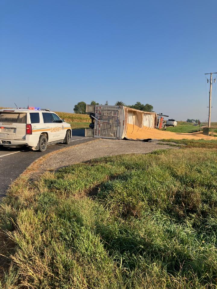 (SW Cass County, IA) – No injuries were reported when a semi tractor-trailer hauling corn overturned this (Tuesday) morning, between Griswold and Lewis. The accident