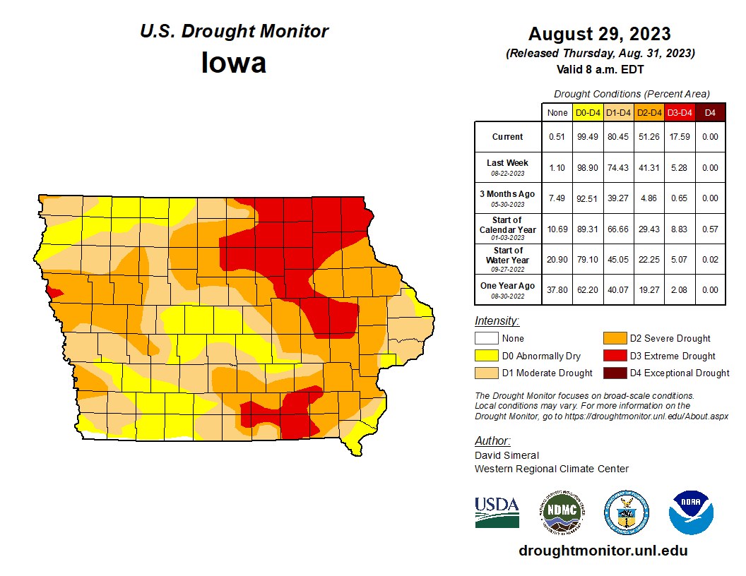 Small sections of Fremont and Ringgold Counties are the only areas of Iowa considered to be drought-free and Glisan says nearly 99-and-a-half percent of the entire state is now in some level of drought. The U-S-D-A began issuing Drought Monitor reports 23 years ago. “This is going into the 166th week of at least D1, that moderate drought category somewhere in the state, so the longest drought that we’ve had since the Drought Monitor came into inception,” Glisan says, “but also longer term than the 1988 and 2012 droughts.” Those two drought years were more intense because of particularly warm temperatures in the upper Midwest, according to Glisan. Glisan says the statewide average rainfall is about three and a quarter inches in August — about an inch below normal, but Glisan says there’s wide variation in sections of the state.