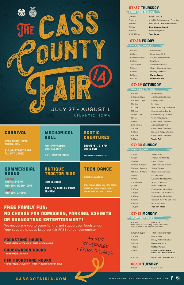 (Atlantic, Iowa) – The 2023 Cass County (Iowa) Fair begins this Thursday (July 27th), and continues through August 1st. Thursday, evening, 14 youth are competing for a place in the royal court. Preliminary judging was held on Monday, July 17th at the Cass County Community Center in Atlantic where each candidate was interviewed by two judges. Candidates vying for the title of queen: Rachel Becker, Sydney Becker, Natalie Behnken, Ryleigh Harrison, Cecilia Hensley, Rio Johnson, Claire Pellett, Natalye Scholl, Quincy Sorensen, Trista Swain. The candidate selected as queen will advance to the Iowa State Fair, where she will compete in the statewide competition for the title of the 2023 Iowa State Fair Queen.