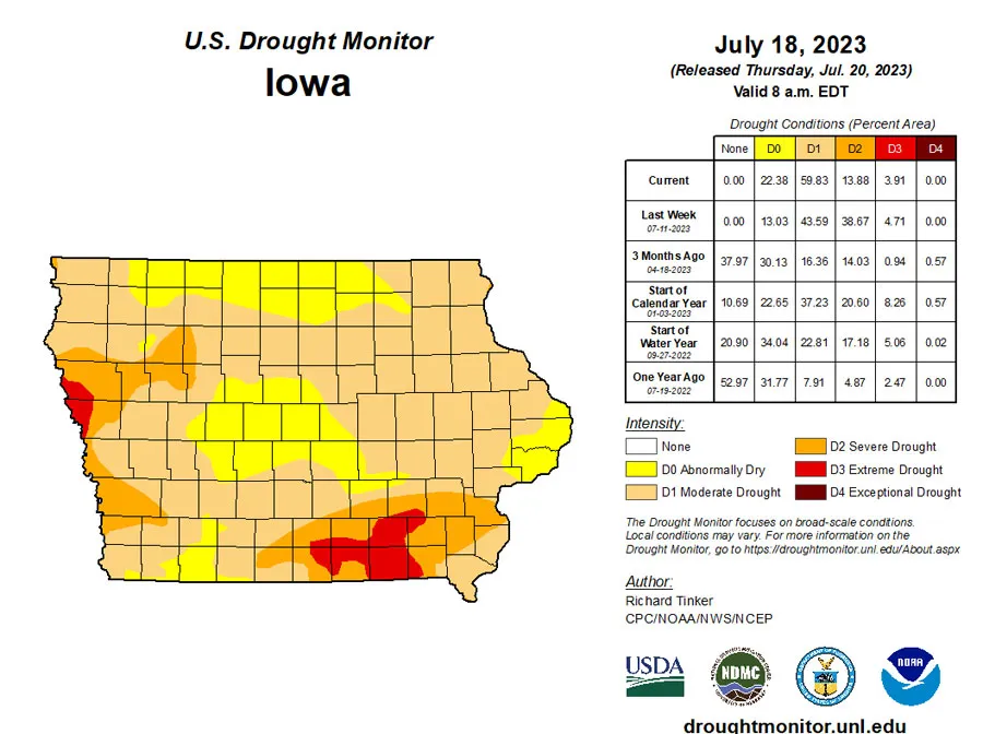 (Radio Iowa) – The new map from the U-S Drought monitor show some slight improvement following rains across the state. All of the state still has some sort of drought rating, but the area that was in extreme drought dropped below four percent in the last week. The severe drought areas dropped from nearly 39 percent to less than 14 percent. With those percentages dropping, nearly 60 percent of the state is now in moderate drought, and around 22 percent is abnormally dry. The worst drought conditions remain in northwest and southeast sections of the state.