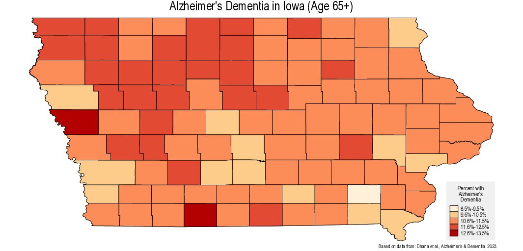 Brianne Fitzgerald, a senior director with the association’s Iowa chapter, says two rural counties topped the state’s list: “Our highest two counties in Iowa were Monona in western Iowa at 12.6%, and Ringgold in southern Iowa 12.9%.” By comparison, the nation’s highest incidence of Alzheimer’s is nearly four points higher at 16.6% with a three-way tie between Miami-Dade County, Florida; Baltimore City, Maryland; and Bronx County, New York.