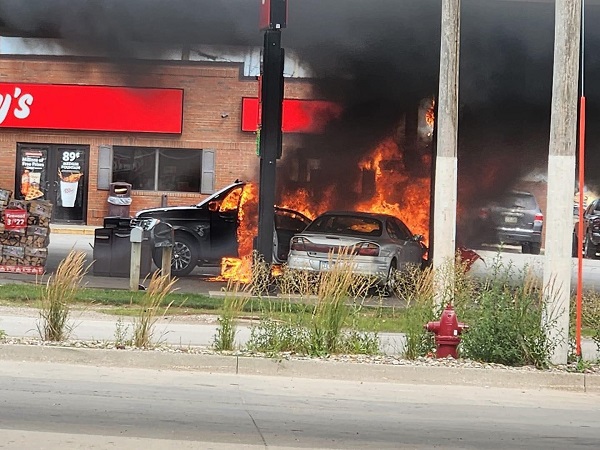 (Adair, Iowa) – Two vehicles were engulfed in flames late this (Monday) afternoon, in Adair. The accident happened at around 4-p.m. The fire erupted after a vehicle struck one of the gas pumps at the Casey’s General Store. Adair Fire Chief Matt Richter told KJAN News a vehicle came off of the Interstate ramp and went out of control before striking a gas pump, knocking it off of its base. The vehicle that struck the pump and a second vehicle, described as Ford, both caught fire.