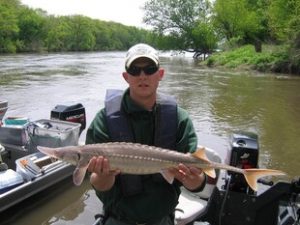 The affected section of the Des Moines River has had sizable fish kills over the years caused by low water levels and high water temperatures, with the most recent in 2012. DNR fisheries staff partnered with Missouri Conservation to research the cause of that kill and learn more about the effects to shovelnose sturgeon populations.