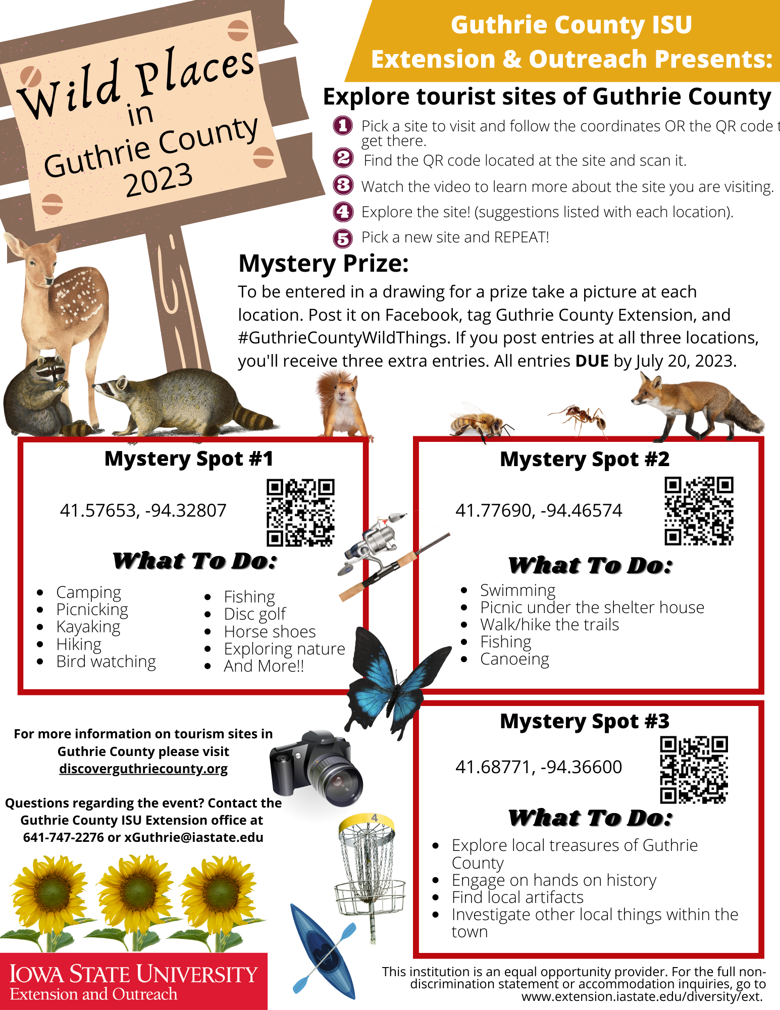 Guthrie County Extension is also offering a mystery prize to two lucky people. To be entered in a drawing for a prize take a picture at each location. Post your pictures on Facebook, tag Guthrie County Extension, and #GuthrieCountyWildThings. If you post entries at all three locations, you’ll receive three extra entries. All entries will be due by July 20th, 2023.