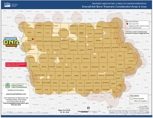 (Radio Iowa) – There are now just two Iowa counties without an emerald ash borer infestation. The Iowa Department of Agriculture says the wood-boring beetle has been confirmed for the first time in Plymouth County after a tree service found evidence of the bug in an ash tree in Remsen. Plymouth is the 97th Iowa County to have a confirmed infestation, and that leaves just Emmet and Palo Alto County without the invasive beetle. E-A-B was first discovered in Iowa in Allamakee County in 2010.