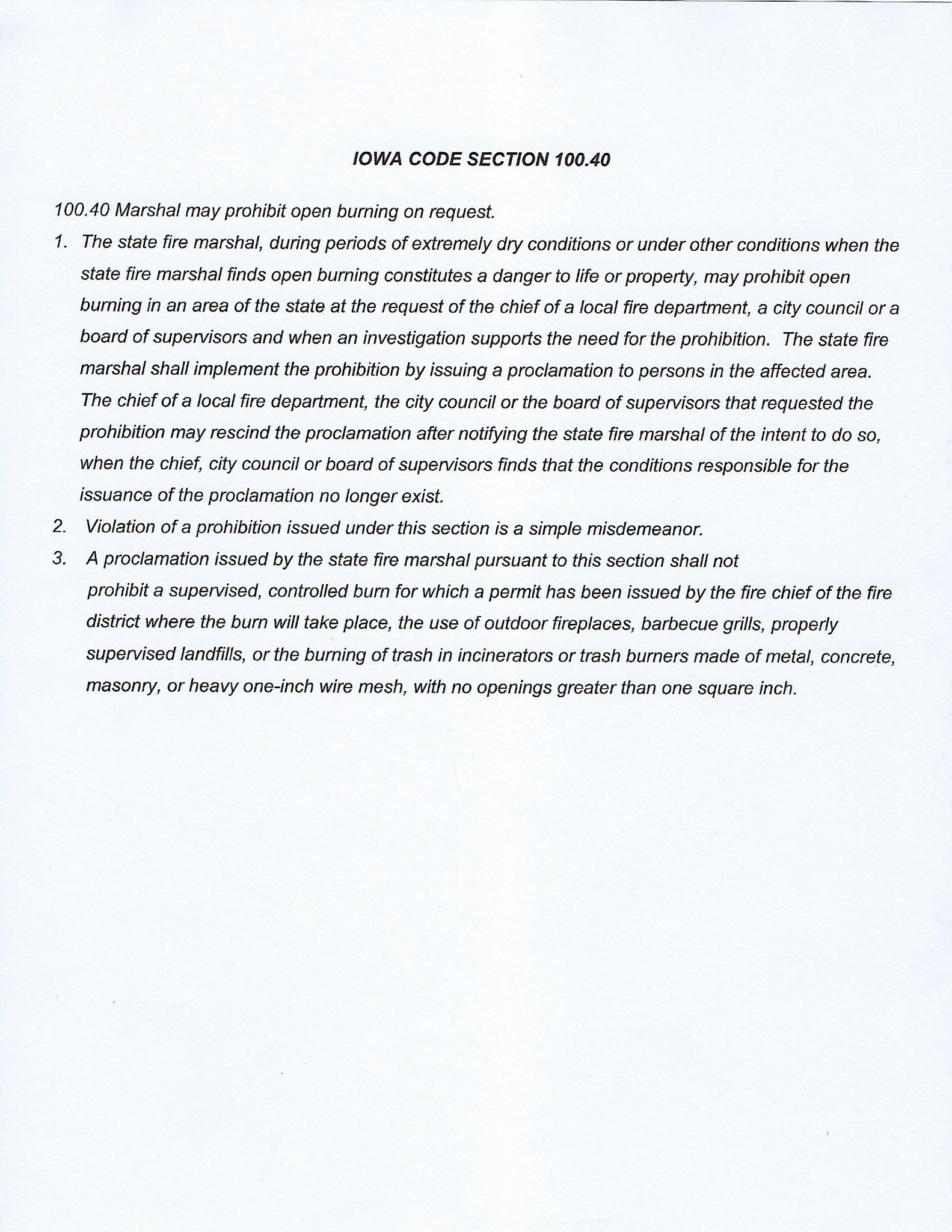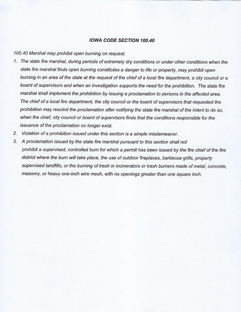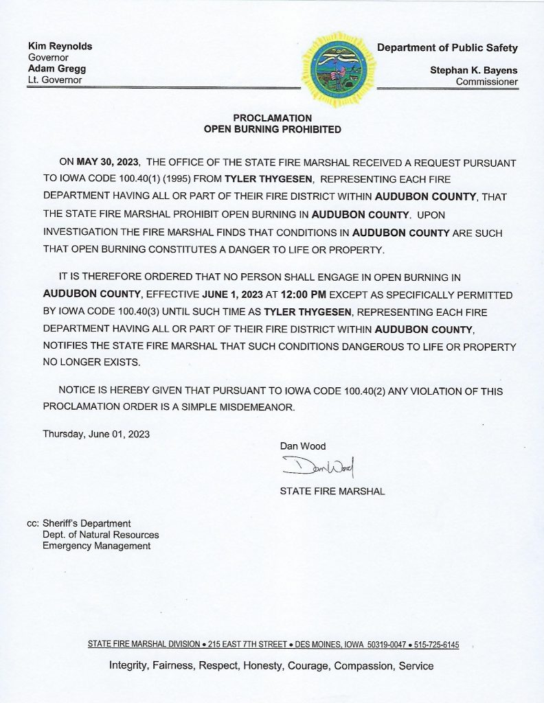 (Audubon, Iowa) – Officials in Audubon County, today (Thursday), said “Due to current water and drought conditions in our county, the four Fire Chiefs have made a decision to place Audubon County in a burn ban until further notice.” Authorities said also, “We appreciate your understanding and cooperation.” Details of the Burn Ban can be viewed in the documents below: