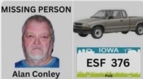 (Des Moines, Iowa) – Authorities in central Iowa are asking for your help in locating a Des Moines man went missing early Monday morning (Feb. 6, 2023), and who may be experiencing medical issues. Des Moines Police say 76-year-old Alan Wayne Conley left his north Des Moines home at around 2-a.m. Monday. Conley was driving a metallic beige/tan 2002 Chevrolet S-10 pickup truck with damage on the passenger side. The vehicle has Iowa license plate ESF 376. The rear plate was being held on by a green bungee cord, according to family and friends. There is also a dent on the back bumper and a sticker that may be a Harley Davidson logo.