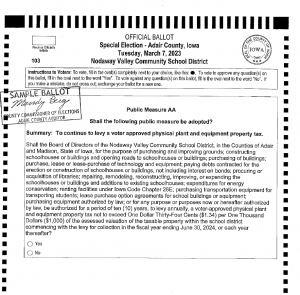 (Greenfield, Iowa) – The Adair County Auditor’s Office has released information with regard to Absentee voter registration and ballot deadlines, in advance of the March 7th Special Election of the Nodaway Valley Community School District. On the ballot is Public Measure AA (summarized below):