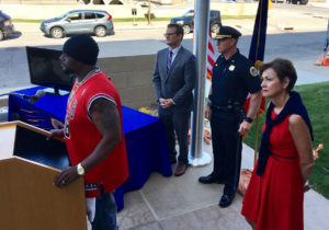Will Keeps talks about his anti-crime video in 2017 as the governor looks on. (RI photo)