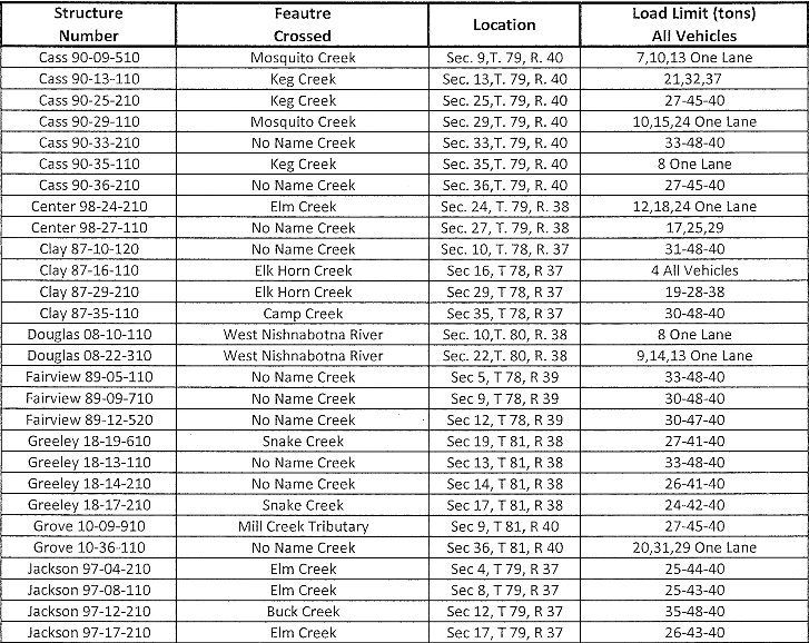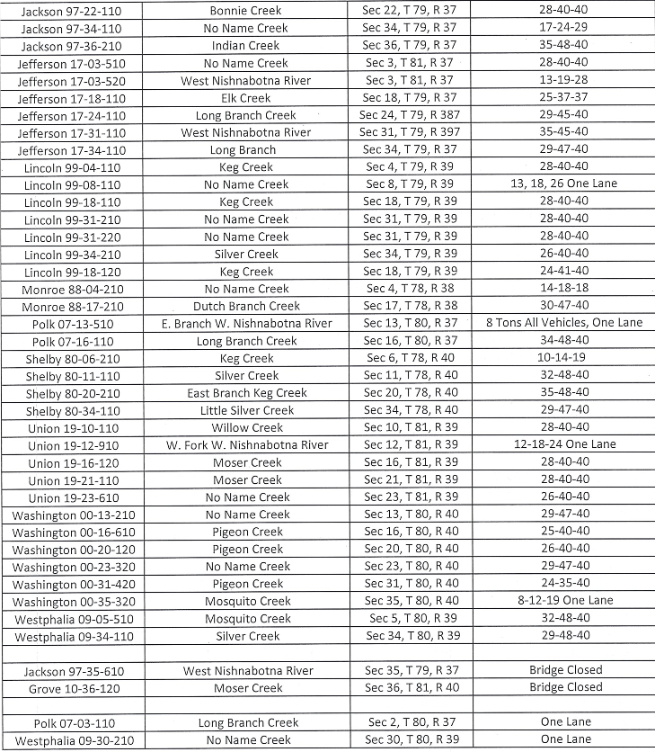 (Harlan, Iowa) – The Shelby County Board of Supervisors, Tuesday, passed a Resolution imposing restrictions on the weight of vehicles (load limits) crossing certain bridges on designated highways or highway structures under the County’s jurisdiction.(See the list below)
