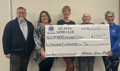 (Atlantic, Iowa, 12/12/22) – This fall, the Atlantic Lions Club pancake supper and bake sale raised $2,500 for free mental health support groups in Cass County organized by NAMI Southwest Iowa (the Southwest Iowa affiliate of the National Alliance on Mental Illness, otherwise known as NAMI). Cass County Wellness Coordinator Brigham Hoegh says NAMI Southwest Iowa currently offers in-person peer support groups at 2:00 PM on the first and third Thursdays of every month at the United Church of Christ in Atlantic (1607 Hazel St., Atlantic, IA 50022), as well as virtual peer support groups at 10:00 AM every Monday and 6:30 PM every Thursday. NAMI Southwest Iowa also offers a virtual family support group at 6:30 PM on the first Tuesday of the month. Additional NAMI Southwest Iowa in-person support groups are available in Clarinda and Council Bluffs.