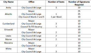 (Atlantic, Iowa) – Cass County Auditor and Commissioner of Elections Kathy Somers has issued a notification to residents of Cass County, that the first day to file nomination papers for the upcoming City/School Election is Monday, August 25, 2025. The last day to file is Thursday, September 18, 2025, at 5:00 PM. City candidates shall file nomination papers with the county auditor. School board candidates shall file nomination papers with the respective school board secretary.