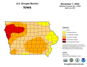 (Des Moines, Iowa) – The latest drought monitor released Thursday morning, shows just how badly Iowa could use rain. Right now, the entire state remains in some type of drought. Nearly 89% of Iowa is moderately dry with nearly 11% in extreme drought, that latter of which is showing up in northwest and western areas, and is up from seven-percent just last week. Cass and most contiguous Counties are shown to be in a Moderate drought, with parts of Shelby and Montgomery in a severe drought, along with Harrison, Mills, Fremont and Page Counties.