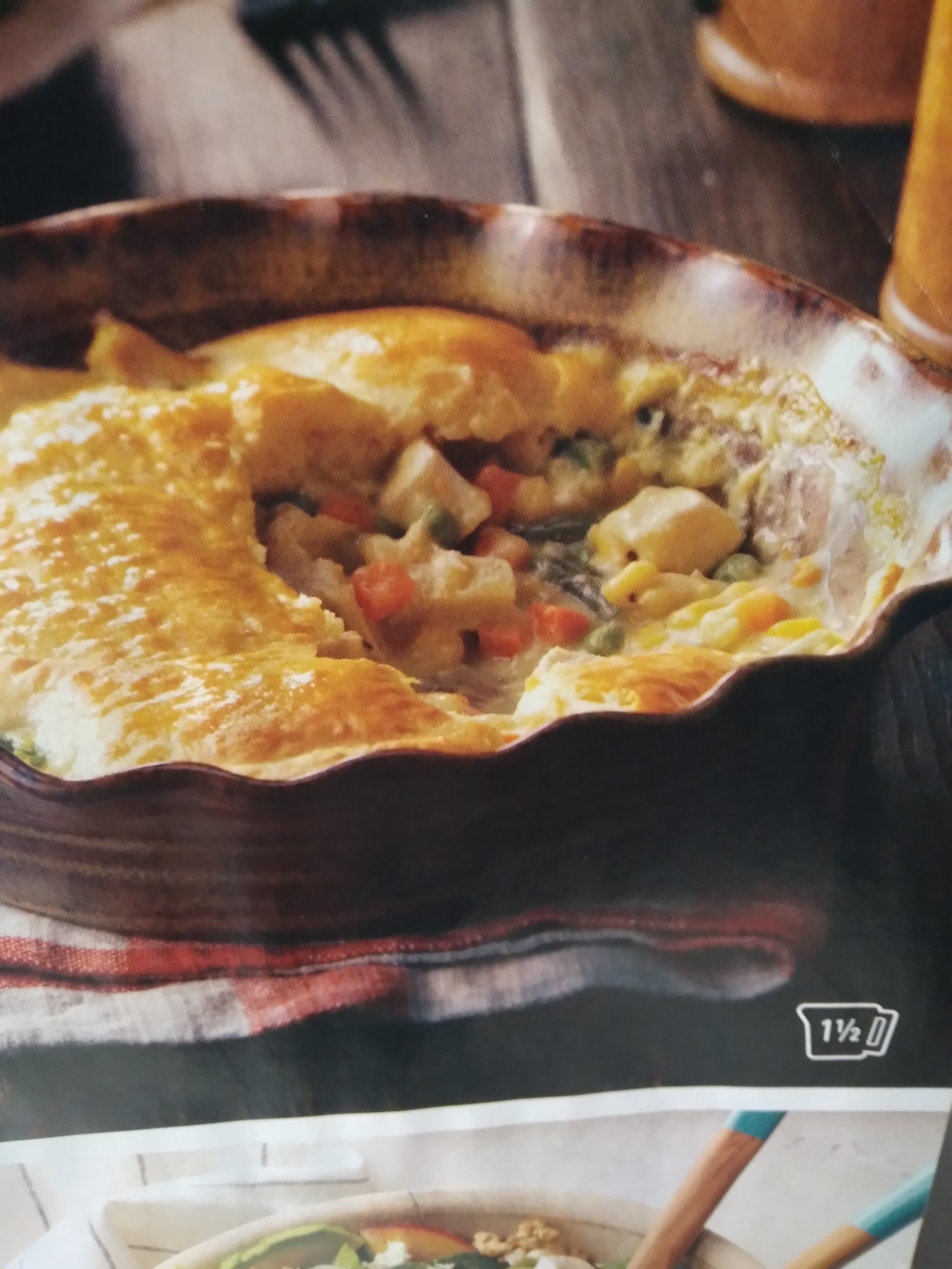 In a bowl, combine vegetables, chicken, soup and thyme. Pour into ungreased deep dish 9″ pie plate. Combine biscuit mix, milk and egg; spoon dough over the chicken mixture.