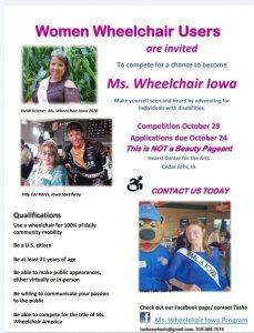 The deadline to apply is October 24th. To apply, contact DeGroote through the Ms. Wheelchair Iowa Facebook page, at tashaswheels@gmail.com or at (319) 464-7574. This year’s contest will be held October 29th at the Hearst Center for the Arts in Cedar Falls.