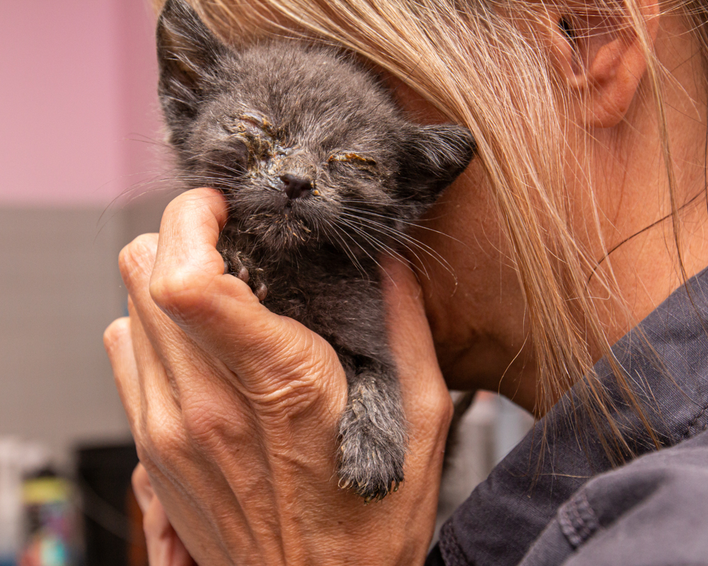 The organizations’ “Miracle Medical Team” was waiting to triage as soon as they arrived back from the two-hour drive. The kittens were said top be in the most critical condition. Many were thin, with eyes so infected they’re matted shut and upper respiratory infections so bad they sneeze constantly. All the cats and kittens were crawling with fleas and ear mites – particularly dangerous for kittens so small.